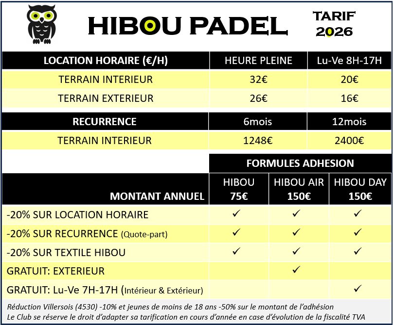 | 1) Remplissez le formulaire d’adhésion de votre choix en cliquant sur un des liens suivants: Formule HIBOU, Formule HIBOU AIR, Formule HIBOU DAY. 2) Verser le montant de votre adhésion sur le compte bancaire BE33068946809246 avec la communication « Adhésion Nom Prénom ». Dès réception du paiement et mise à jour de la plateforme MATCHi, une notification par e-mail vous sera envoyée pour confirmer votre nouvelle adhésion. L’information sera également immédiatement disponible sur l’application MATCHi dans votre Profil. Attention, si vous désirez inscrire plusieurs personnes en même temps, une demande par joueur doit être créée. Par conséquent, merci d’envoyer les informations d’inscription ci-dessus pour chaque joueur. NB: Adhésion s’entend valable pour l’année en-cours uniquement ce qui signifie valable jusqu’au 31 décembre. |