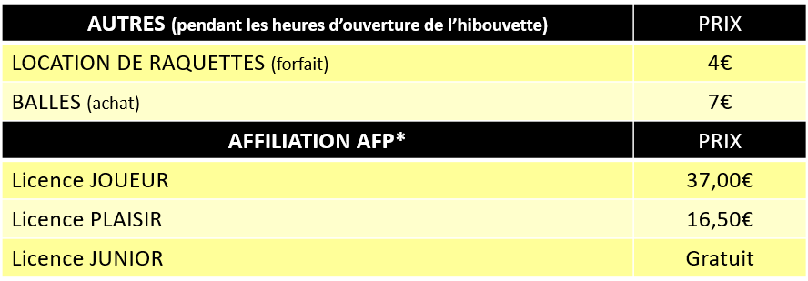 Il est interdit de laisser quelqu’un d’autre jouer sous son nom sous peine d’annulation de l’adhésion. Les réservations sont possibles 14 jours à l’avance. En cas d’intempéries, le Club se réserve le droit d’annuler les réservations par sécurité. Location de raquettes et achat de balles possible pendant les ouvertures de l’Hibouvette (voir tarifs ci-dessous)